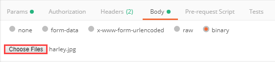 As Headers we add a key “Content-Type” with value “application/octet-stream” and the image that shall be uploaded with that post.