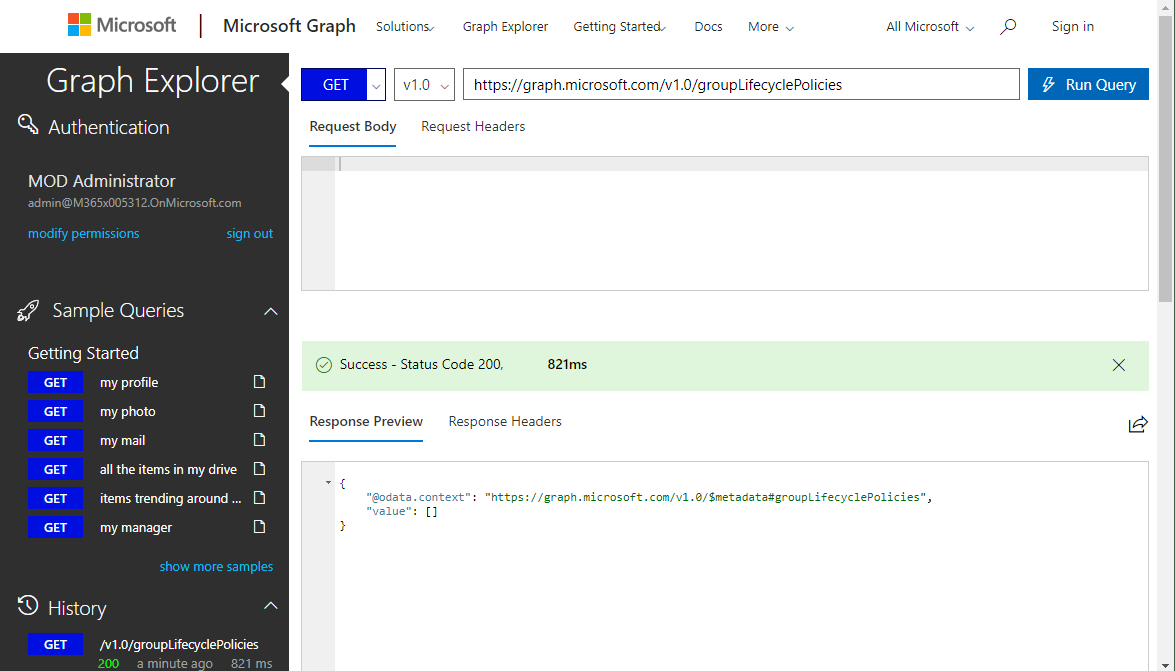 So, the first request delivers existing policies with a HTTP GET against groupLifecyclePolicies. If there´s no group expiration defined, we get an empty value array as here.
