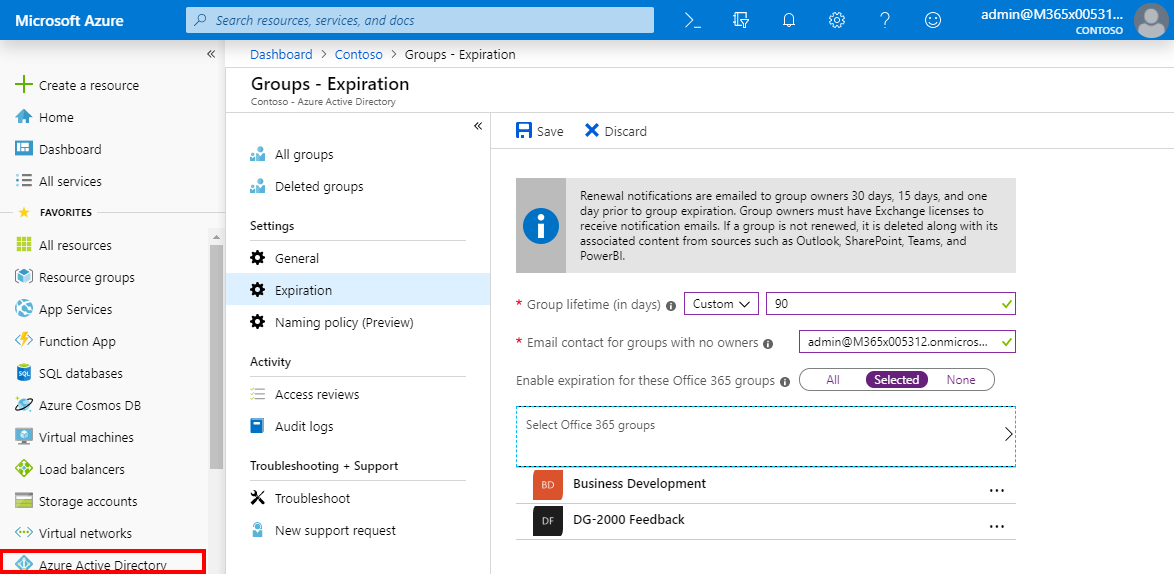 The Group expiration settings can also be defined in the Azure portal, or with PowerShell.