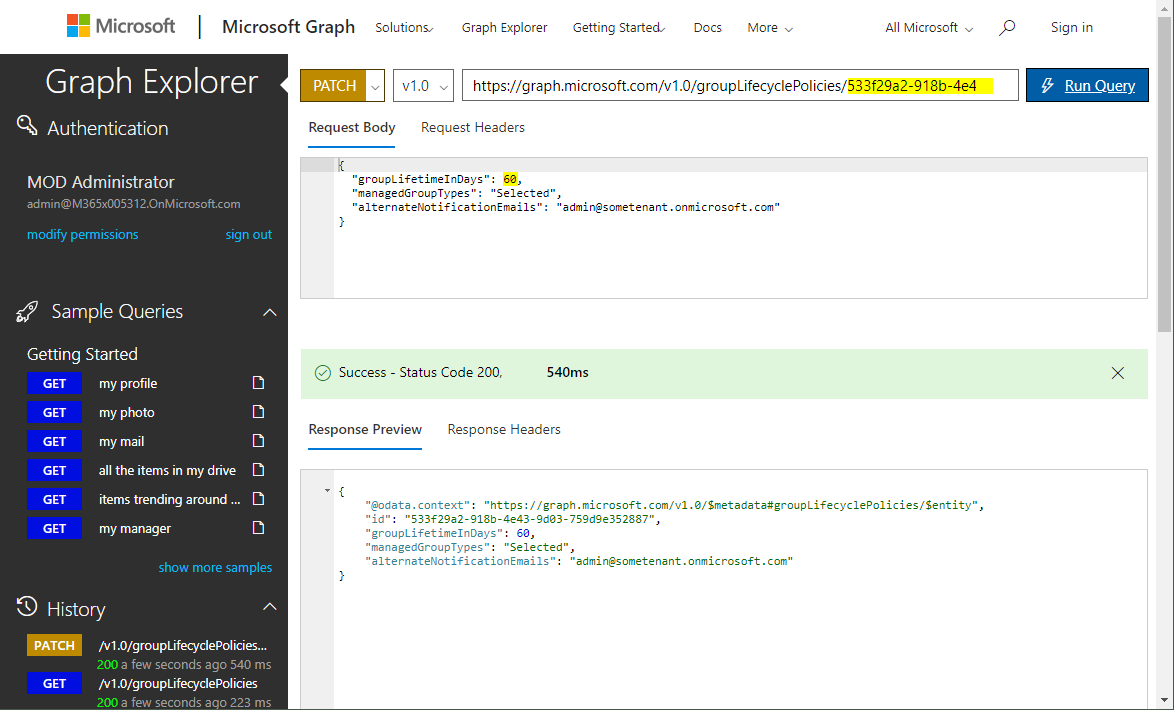 Now we can change values, as setting the expiration time from 90 to 60 days with Graph Explorer. The HTTP request is now a PATCH operation and the settings id is added to the URL and the Request Body holds the data we send to the API as here.