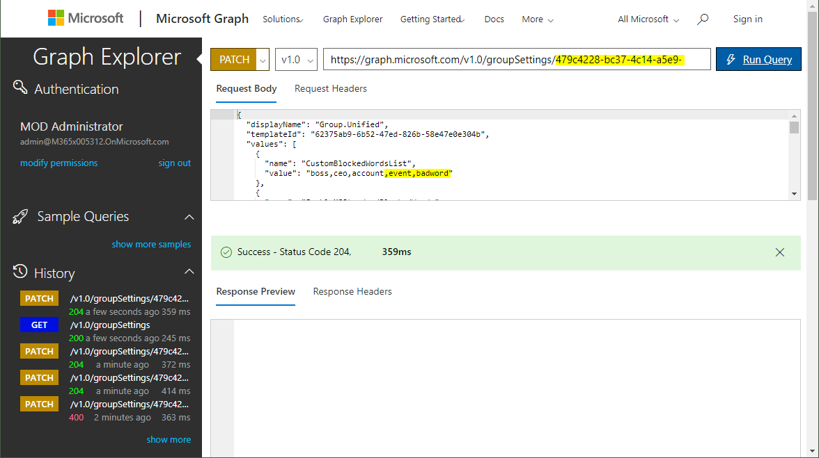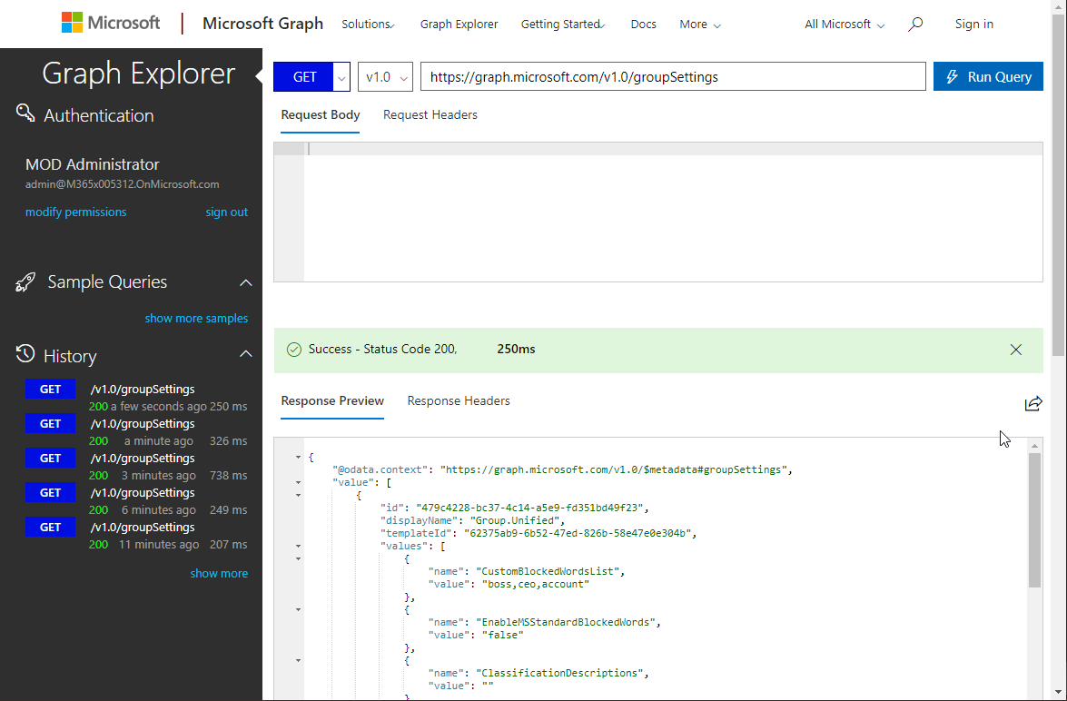 In Graph Explorer, we now see more group settings with a GET request against the groupSettings method.