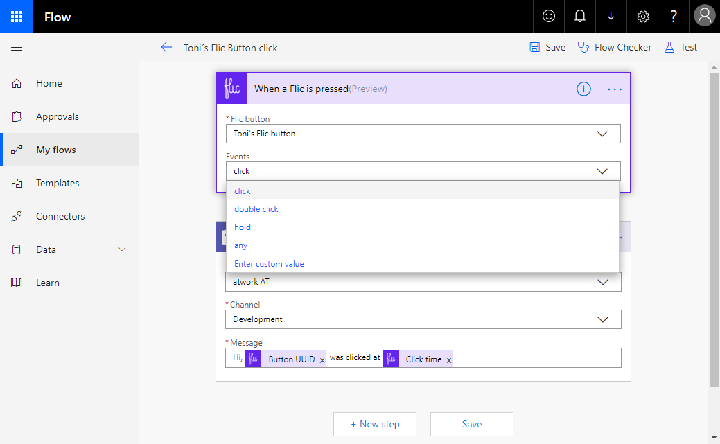 The Flow connector requires the Flic account (username and password) and can be triggered for the events click, double click, hold and any as shown here. As followed action, a new message is posted into a Microsoft Teams channel. In this sample, a text message is sent.