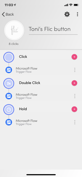 In the Flic app, I simply added “Microsoft Flow”. Through the Flic account and the Flic connector to that button and the event in the Flows, events will be sent to the corresponding Flow. So, the configuration looks as here.