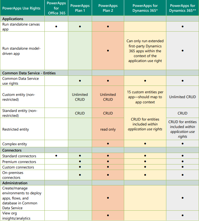 For planning new PowerApps or Flow projects, it´s important to understand the supported features and required licenses. See more at Compare features and pricing.