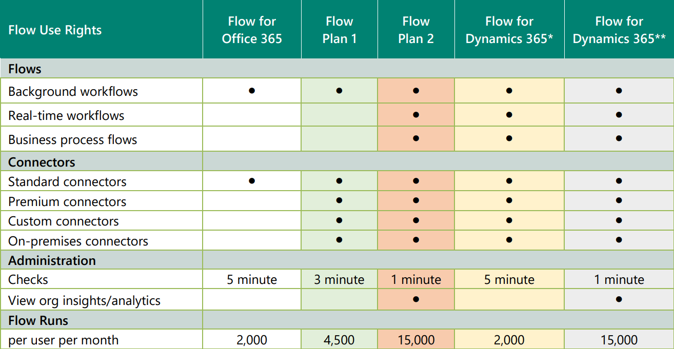 The PDF´s Appendix C: Flow Use Rights shows the Flow feature matrix: