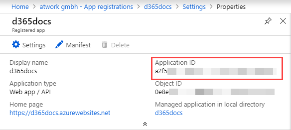 When created, I need the Application ID. The app properties overview shows the most relevant data and the Application ID can be copied from here.