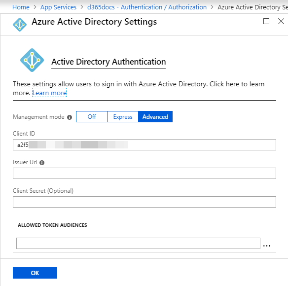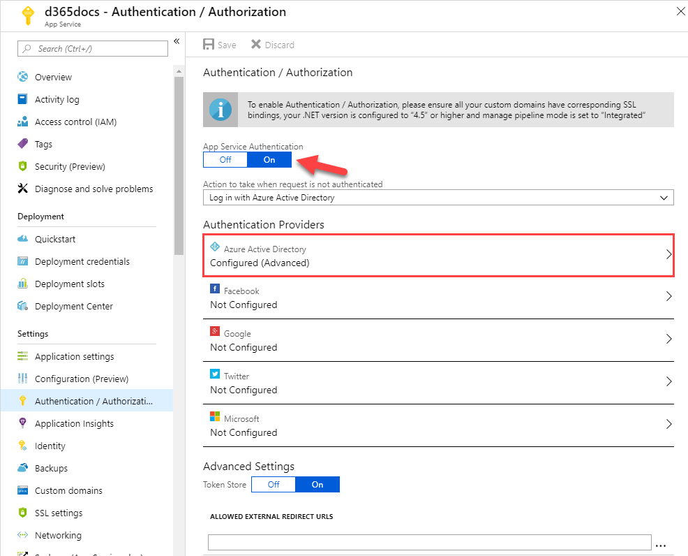 In the web`s Authentication / Authorization page, we set the App Service Authentication to “On” and configure the web app to use AAD with our Application as here.