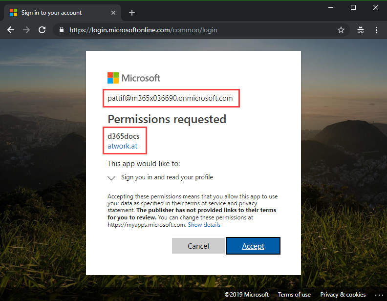 NOW, users with any Office 365 account can open that website. So, when a user opens the website, he gets redirected to the sign-in page. Once signed-in with a personal Office 365 account, the app asks for permission to sign-in. As we see here, PattiF with *her *Office 365 tenant needs to grant access to the Multi tenant app “d365docs” that is stored in the “atwork.at” AAD and wants to sign-in.
