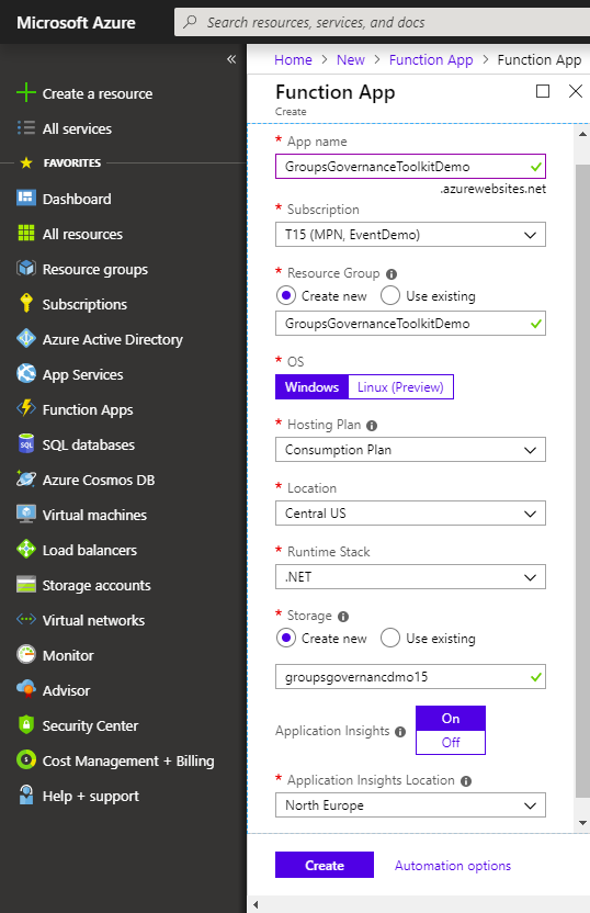 Fill out the Function App form: Provide an App name, the subscription, Resource Group, Hosting Plan “Consumption Plan”, a storage account and the region.