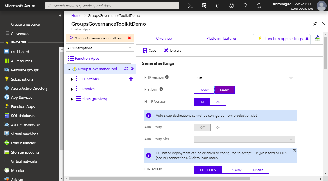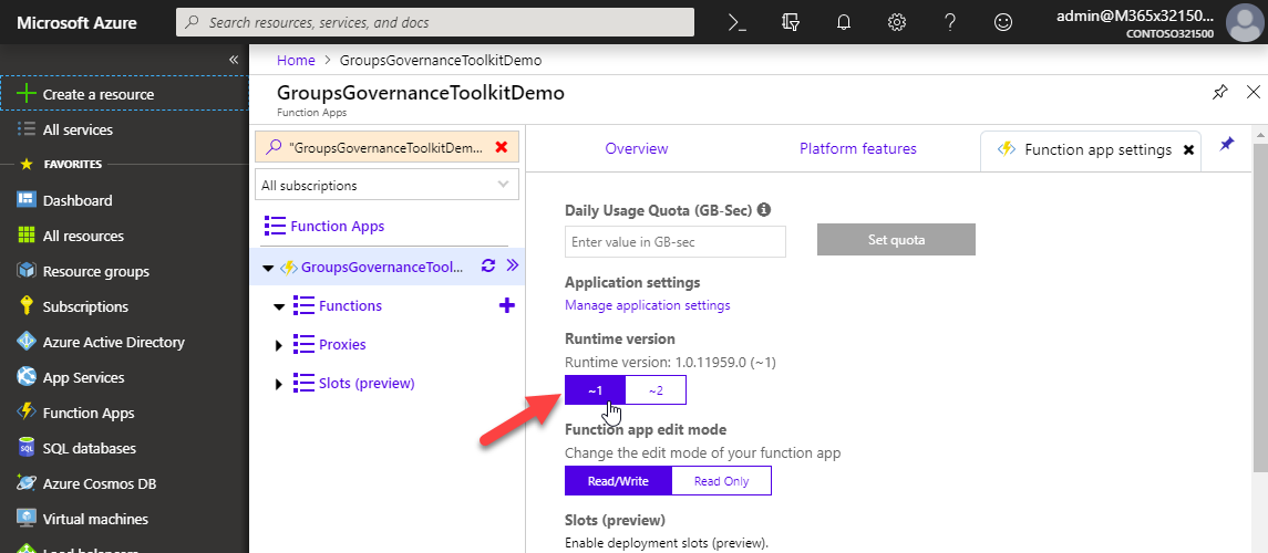 Since our solution is developed in PowerShell, it’s important to change the Runtime Stack to Azure Functions v1: Runtime version: 1.0.11959.0 (~1). This can be done in the Function App settings.