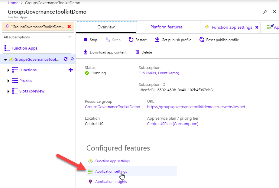 Note: In real world scenarios, it is recommended to use Azure Key Vault to store secrets. For our demo and for other samples, the Application Settings are good enough.