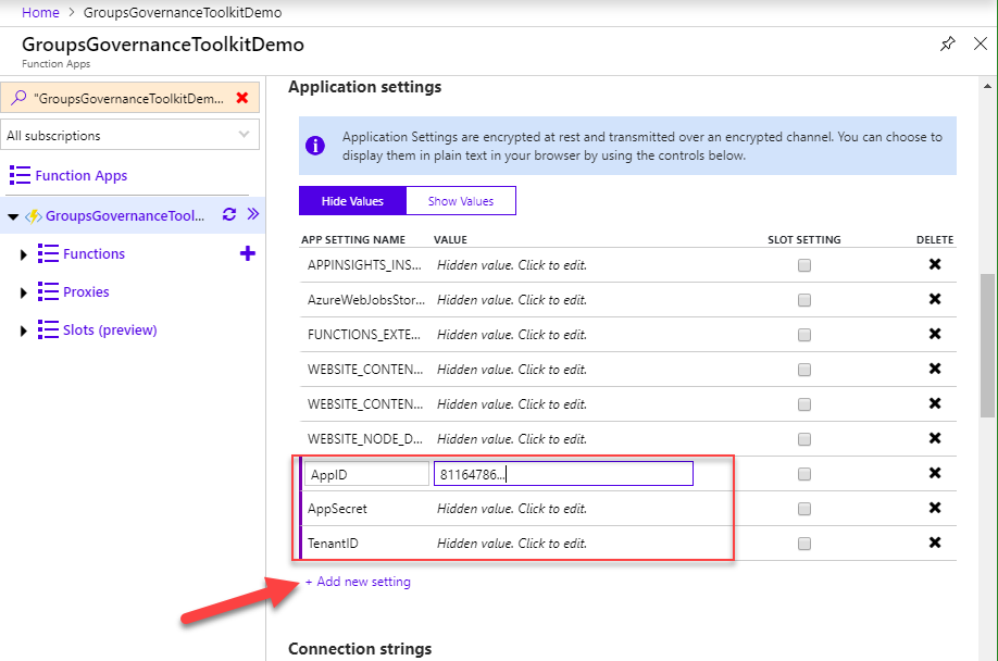 Now, add the values from our created app as shown here. We need keys for AppId, AppSecret and TenantID with the values we saved before. Create the three settings with the “add new setting” link.