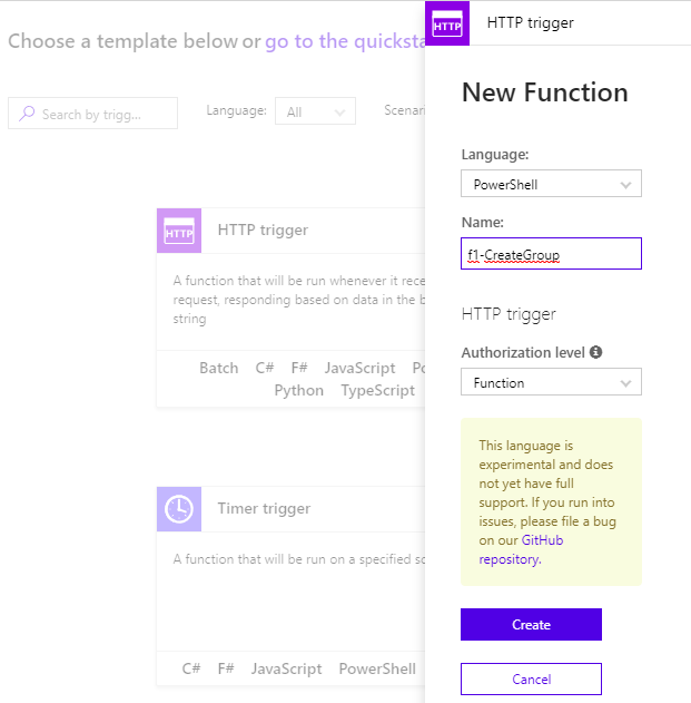 Click on “Experimental Language Support”, so that it shows “Enabled”. Then, click on the “HTTP trigger” PowerShell link.