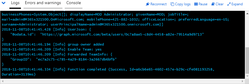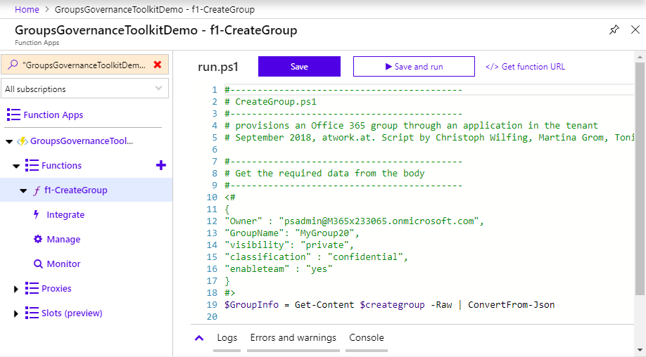 Yay! We now have created the first functions to provision a new Office 365 group or Microsoft Team. The next steps for our governance demo are to monitor the groups for the compliance with our organization’s policies.