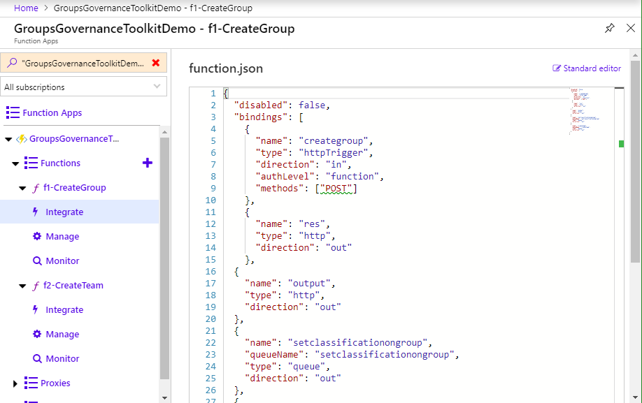 Open the f1-CreateGroup “Integrate” menu and click on the “Advanced editor” link. Copy the f1-CreateGroup/function.json content into the editor as here.