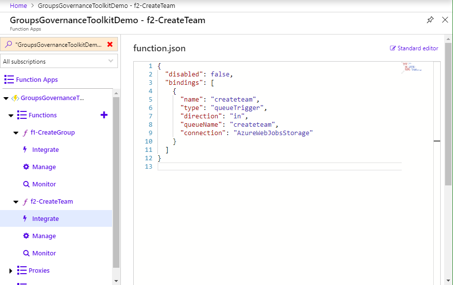 Do the same with f2-CreateTeam “Integrate” menu and click on the “Advanced editor” link. Copy the f2-CreateTeam/function.json content into the editor as here. The binding of f2 listens to a queue and starts when a group shall be provisioned as team, as Microsoft calls it “Teamify”.