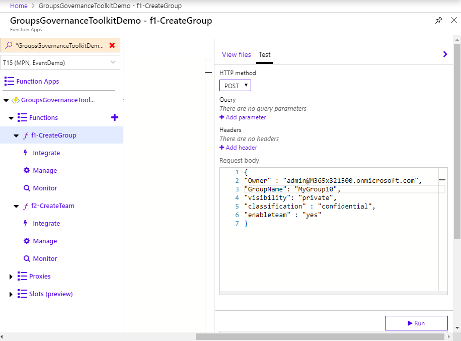 As last part in this article, we can test the creation of a new group or team with our functions. Click on the “Test” link on the right side of the f1-CreateGroup function and use a Request body as here.