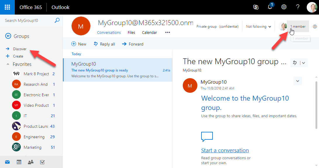 The group provisioning can take some seconds (or even minutes), depending on the tenant and the cloud workload. Anyway, usually, you can see the new group instantly in Outlook with the “Discover” link.