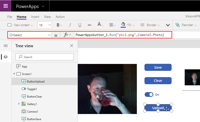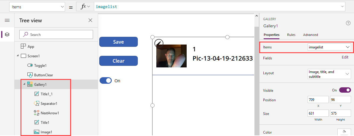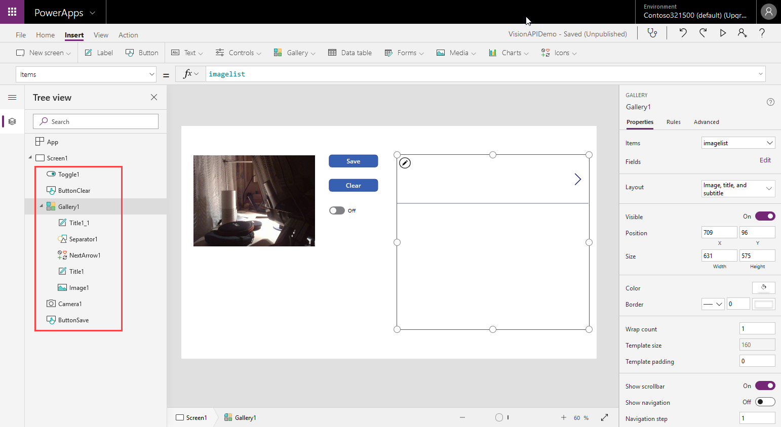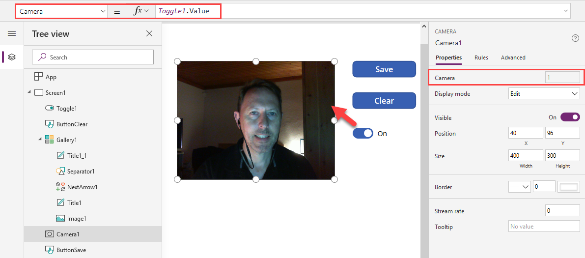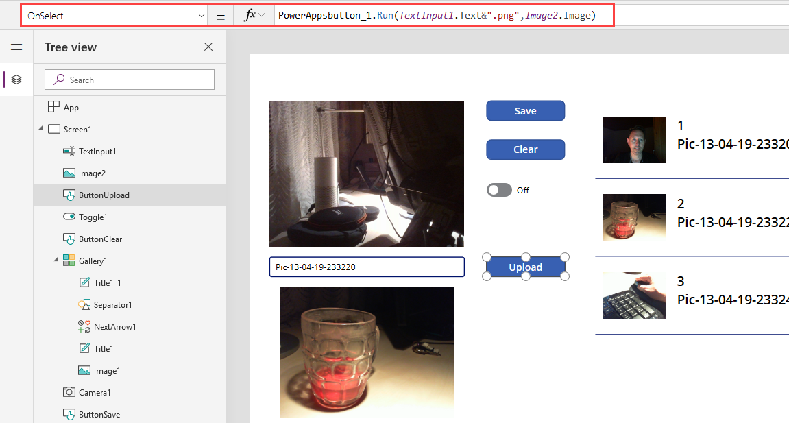 My setup is simple: A blank PowerApp in Tablet Mode with the following controls from left to the right: *Camera1, ButtonSave, ButtonClear, Toggle1 *and Gallery1 as in this screenshot.