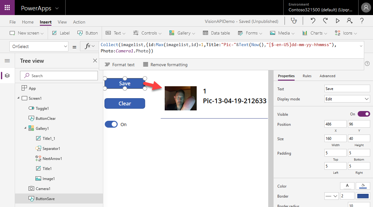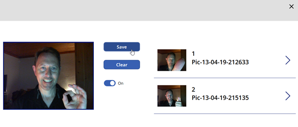 Once a picture is “frozen” (a snapshot has been taken), we can access it with the Camera1.Photo property. To save multiple pictures, it´s handy to save them to a collection. I wanted to save an Id, a title and the photo to a collection named imagelist, so I used this formula to save a picture with a timestamp and a virtual Id: