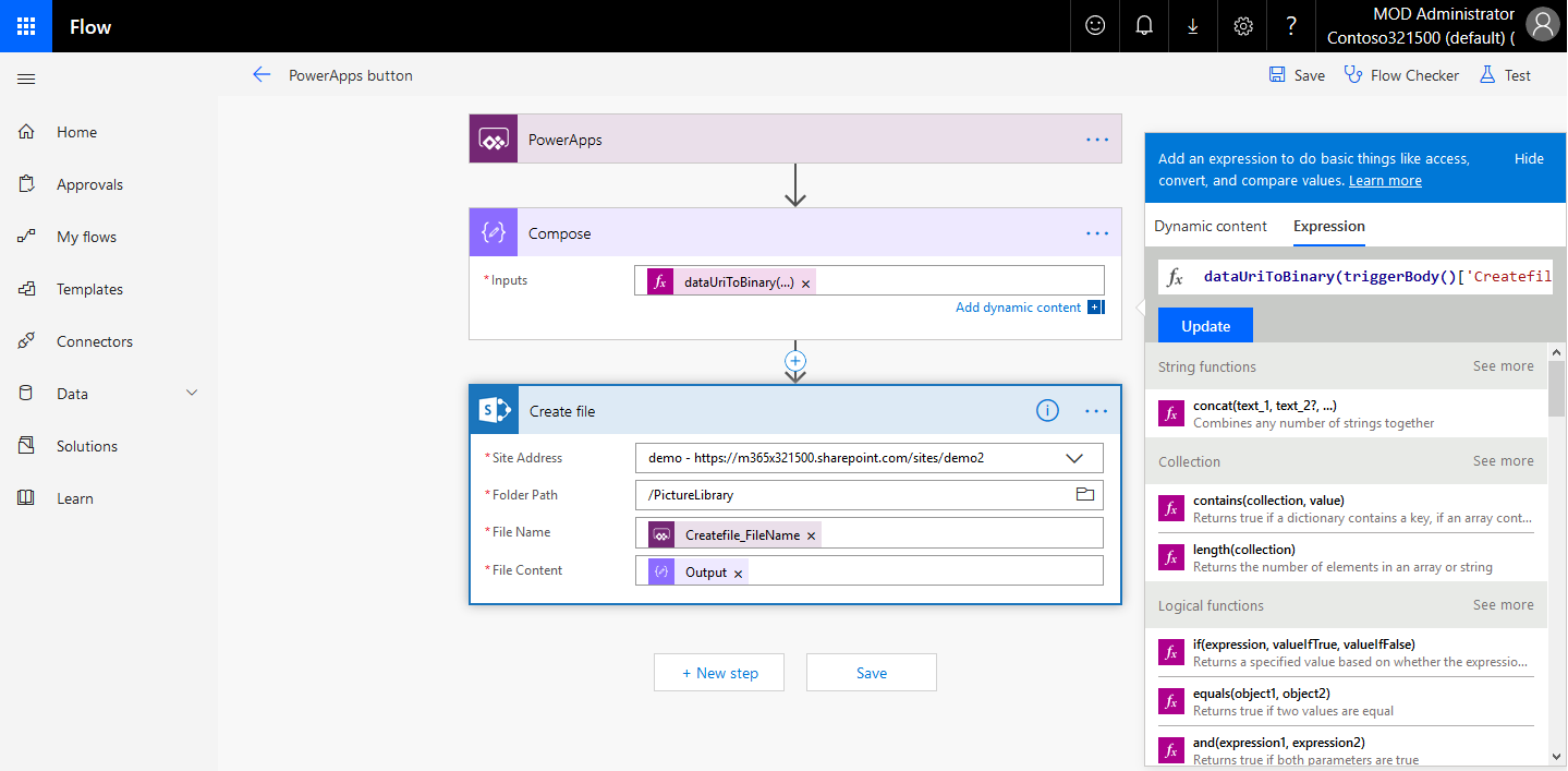 So, let´s add a Flow to a new ButtonUpload. We get data with the “Ask in PowerApps” feature. First, a SharePoint Create File action is added with the connection to a PictureLibrary. Then, a* Data Operation Compose* action is inserted to convert the picture to binary format as here.
