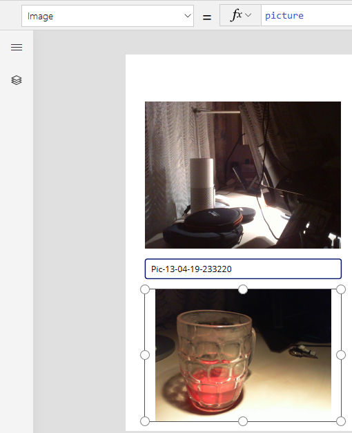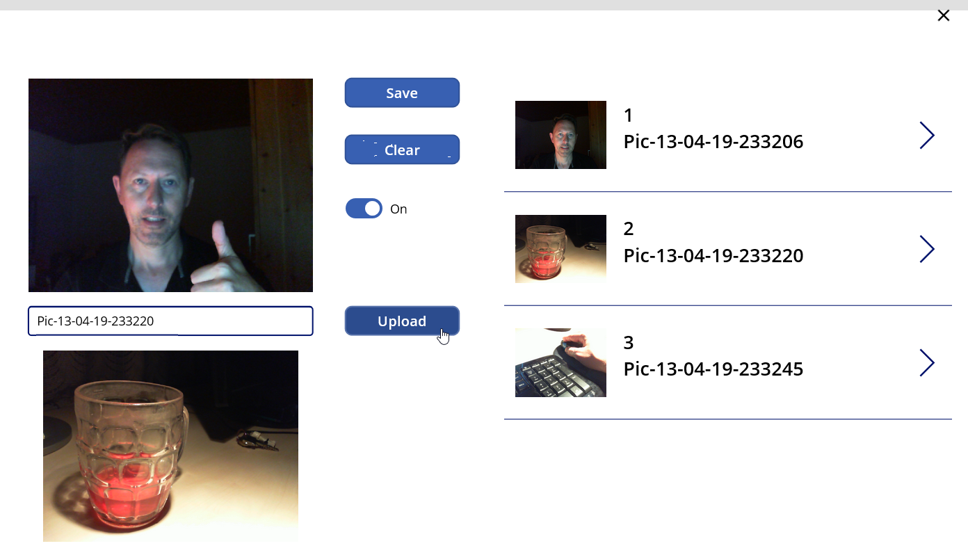 At the end, I wanted to select a “saved” picture from the collection and upload it to SharePoint. So I modified the PowerApp a little bit and added TextInput1 and Image2 and repositioned the Upload button. The idea is to select a picture by clicking on the row and then upload it to SharePoint with the Upload button as here.