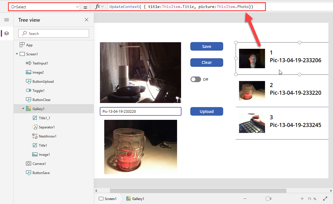 If a user clicks on a row in Gallery1, these two controls show the selected content. Now, let´s finish by changing the Upload button event: