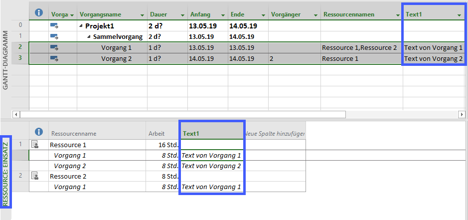 Häufig wird in Foren die Frage gestellt, weshalb Werte benutzerdefinierter Felder in einer Ansicht nicht zur Verfügung stehen. Das liegt üblicherweise daran, dass das Feld für eine Entität erstellt wurde, die in der gewünschten Ansicht nicht zur Verfügung steht. So kann es sich um ein Vorgangsfeld handeln, das in der Ansicht Ressource: Einsatz nicht angezeigt werden kann oder um ein Ressourcenfeld, das in der Ansicht Vorgang: Einsatz nicht verfügbar ist. Das ist auch dann der Fall, wenn die Berechnung für Zuordnungszeilen auf Abwärts zuordnen, wenn nicht manuell eingegeben aktiviert ist: