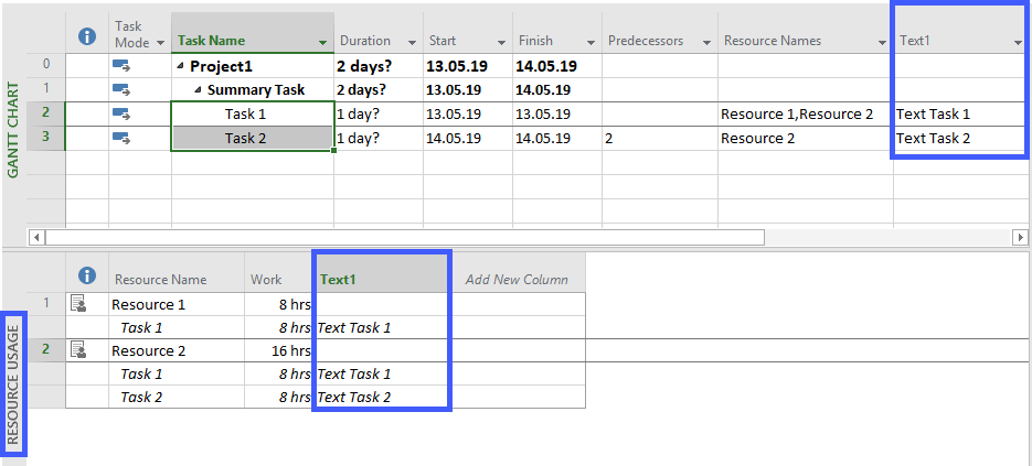There is often a question in forums why values of custom fields are not available in a specific view. This is usually because the field was created for an entity that is not available in the view you want. It can be an task field that can not be displayed in the Resource Usage view or a resource field that is not available in the Task Usage view. This is also the case if Calculation for assignment rows is set to *Rolldown unless manually *entered: