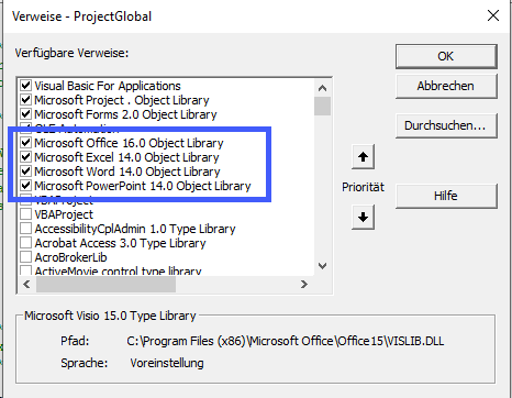 Es werden die Verweise für die drei Officeanwendungen und Microsoft Office benötigt. Die Versionsnummer kann sich auf Ihrem Rechner unterscheiden, wählen Sie die aktuellste Version, sofern mehr als eine zur Verfügung steht.