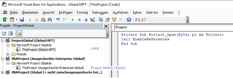 Die Verweise können aber auch über ein Makro gesetzt werden, dass Sie bei jedem Öffnen einen Projekts ausführen. Wenn Sie diese Lösung bevorzugen, fügen Sie den Code: Referenzen beim Öffnen aktivieren / Enable References on Open in ThisProject der entsprechenden Umgebung ein. Dieser Code wird bei jedem Öffnen ausgeführt und ruft die Prozedur zum Setzen der Verweise auf.