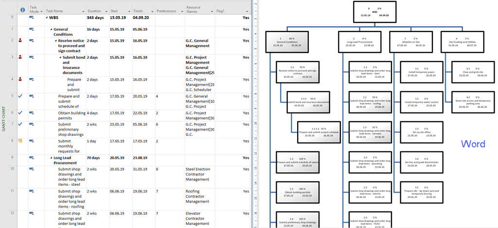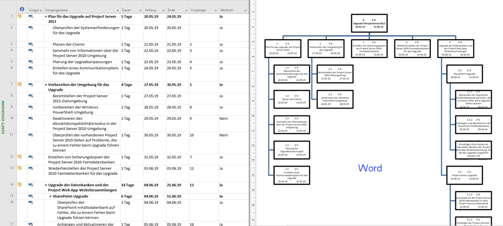 Unfortunately, Project does not provide a way to export the planning as a WBS. However, this requirement is often asked in forums and also by customers. Here’s a macro that provides a SmartArt graphic in Excel, Word, and PowerPoint. In order to run one of these office applications from Project, references must be set to the respective application. The references should ideally be placed in the global template. When working without connecting to Project Online / Project Server, this is the Global.mpt file. This file contains all the objects that are available on the computer for all projects. When connecting to Project Online / Project Server, you must enable the references in Enterprise Global. ### Activate References Manually