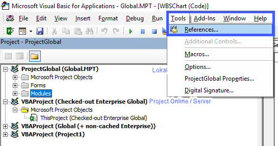 These references can be activated manually. Open the Visual Basic Editor. Make sure that ProjectGlobal (Global.MPT) or VBAProject (Checked-Out Enterprise Global) is enabled. Open the References dialog with Tools - References.