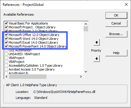 The references for the three office applications and Microsoft Office are needed. The version number may differ on your machine, choose the latest version, if more than one is available.