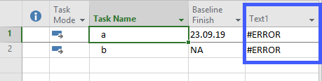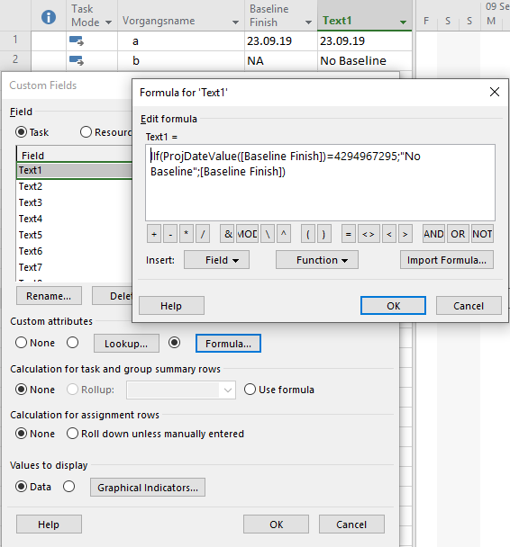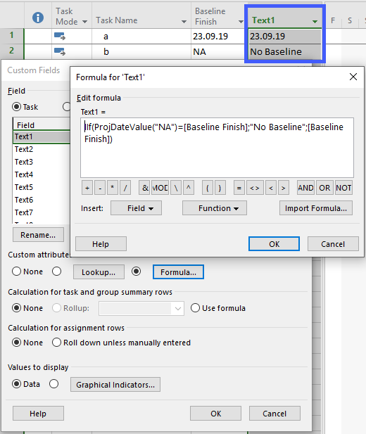 Formula with “,” as list separator: IIf (ProjDateValue (“NA”) = [Baseline Finish], “No Baseline”. [Baseline Finish])