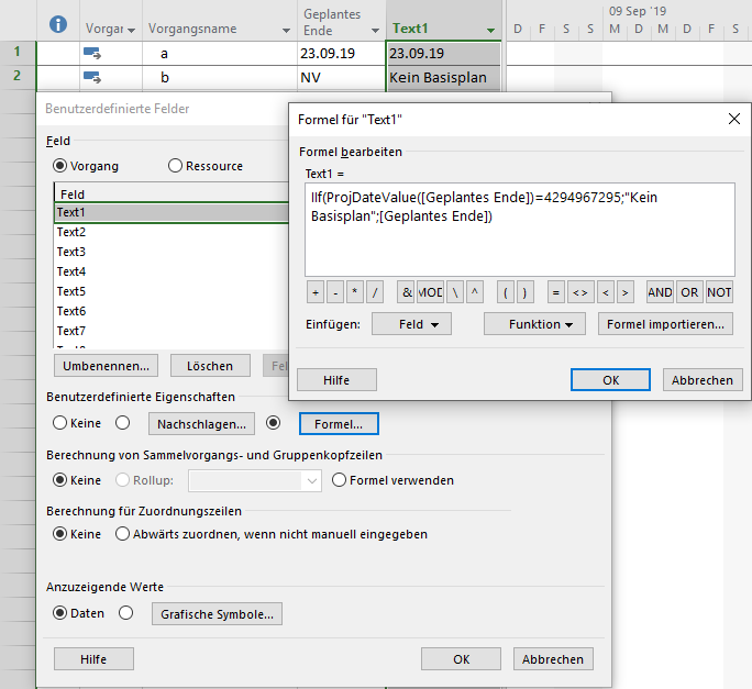 Formel mit “;” als Listentrennzeichen: IIf(ProjDateValue([Geplantes Ende])=4294967295;“Kein Basisplan”;[Geplantes Ende])