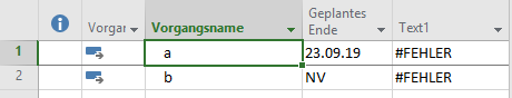 Formel mit “,” als Listentrennzeichen: IIf(ProjDateValue(“NV”)=[Geplantes Ende],“Kein Basisplan”,[Geplantes Ende])