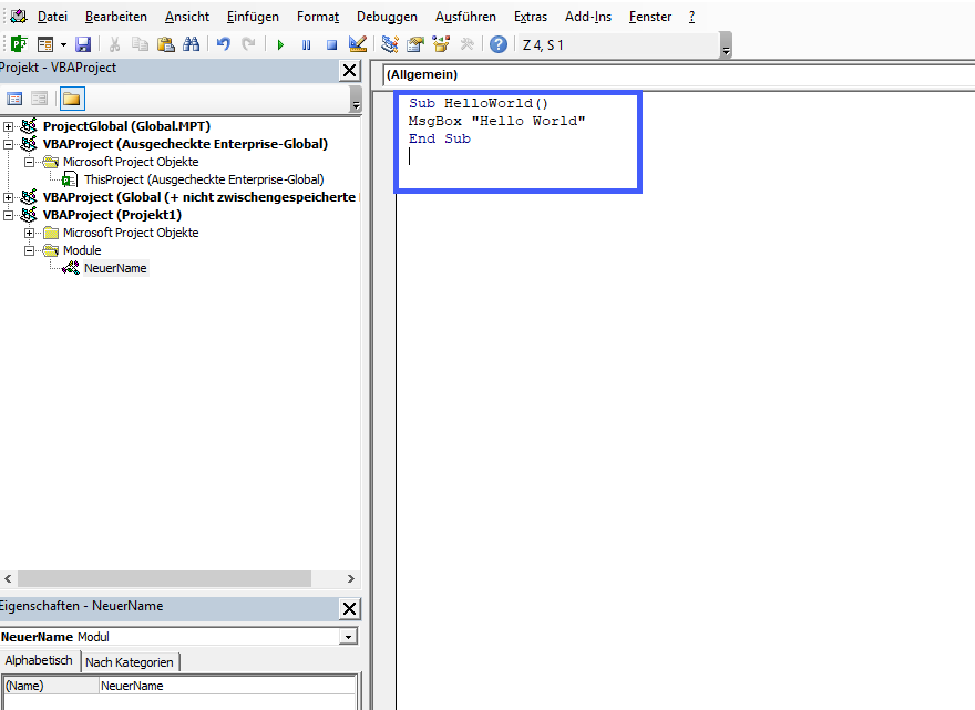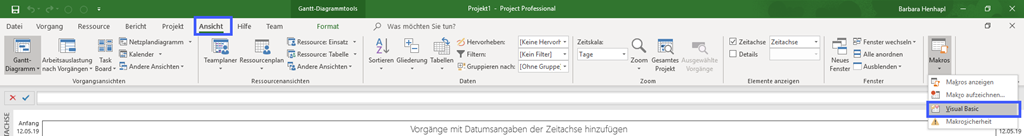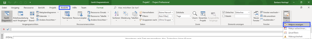 Um ein vorhandenes Makro in Project zu übernehmen, wird der Editor Microsoft Visual Basic for Applications benötigt. Starten Sie den Editor über Ansicht – Makros – Visual Basic oder drücken Sie die Taste F11.