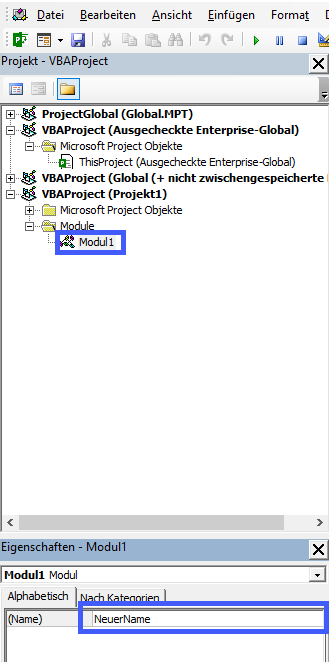 VBAProject (Ausgecheckte Enterprise-Global): Dieses Projekt wird nur angezeigt, wenn Project mit einer Verbindung zu Project Online oder Project Server gestartet wurde und die Enterprise Global geöffnet wurde. Fügen Sie Makros hier ein, wenn sie für alle Anwender bei Verbindung mit Project Server oder Project Online auf allen Rechnern zur Verfügung stehen sollen.
