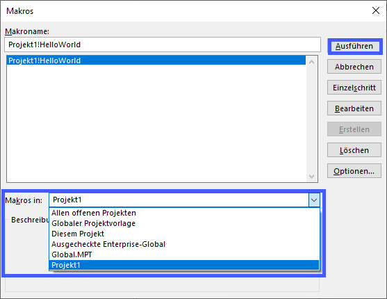 Wählen Sie bei Bedarf das Projekt, das das Makro beinhaltet in Makros in aus. Markieren Sie das gewünschte Projekt und klicken Sie auf Ausführen.