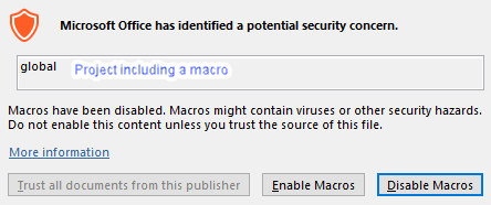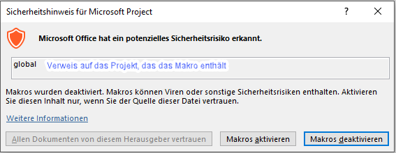 Wenn Makros in Project oder in einem Projektplan enthalten sind, sehen Sie mit den Standardeinstellungen eine Warnmeldung beim Start von Project und/oder beim Öffnen eines Projektplans. Sie können dann wahlweise Makros aktivieren oder deaktivieren.