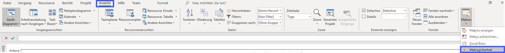 Wenn Sie über eine digitale Signatur verfügen oder nur eigene Makros in Project und Projektplänen haben, können Sie die Warnmeldung auch deaktivieren. Wählen Sie dazu unter Ansicht – Makros – Makrosicherheit..