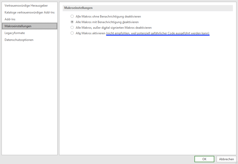 Im Dialogfenster Trust-Center können Sie die gewünschte Einstellung vornehmen. Beachten und bedenken Sie dabei die Warnmeldung für die Option Alle Makros aktivieren.