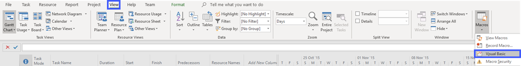 To implement an existing macro in Project, you need the Microsoft Visual Basic for Applications editor. Start the editor via *View - Macros - Visual Basic *or hit key F11.