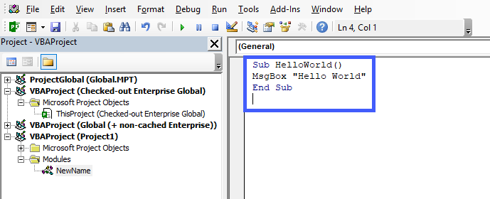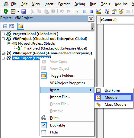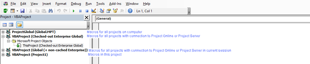 VBAProject (Checked-out Enterprise Global): This project only appears if Project has been started with a connection to Project Online or Project Server and the Enterprise Global has been opened. Insert macros here if they are to be available to all users when connected to Project Server or Project Online on all machines.