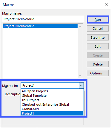 If necessary, select the project that contains the macro in macros. Select the desired project and click on Run.