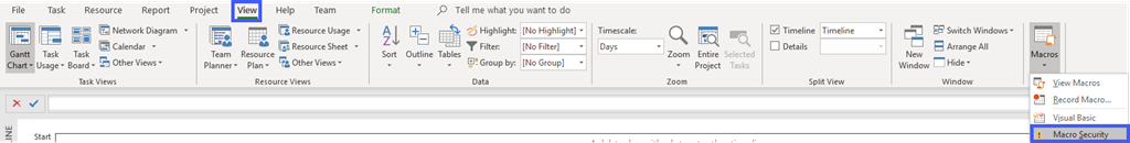 If you have a digital signature or only have your own macros in Project and Project Plans, you can also disable the warning message. Choose under View - Macros - Macro Security. **