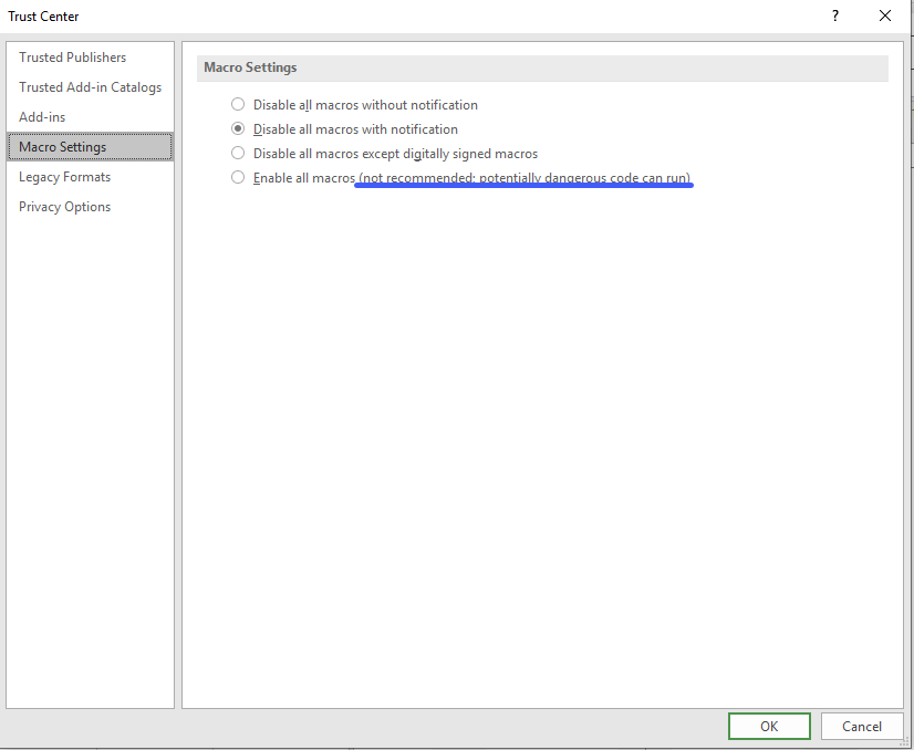 In the Trust Center dialog box, you can make the desired setting. Note and consider the warning message for the* Enable all macros* option.