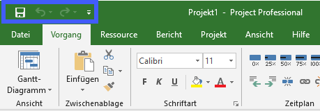 Analog zu allen Officeanwendungen ab Version 2007 können Sie in Project ab Version 2010 die Symbolleiste für den Schnellzugriff anpassen. Damit können Sie Befehle, die Sie häufig benötigen, sehr komfortabel für den einfachen Zugriff bereitstellen. Ohne Anpassung stehen die Befehle Speicher, Rückgängig und Wiederholen zur Verfügung.