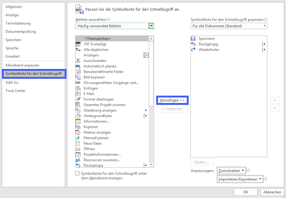 Oft werden aber Befehle vermisst, die nur durch mehrmalige Mausklicks zu erreichen sind, wie zum Beispiel Drucken oder bei Einsatz von Project Online oder Project Server Veröffentlichen. Sie können sich die gewünschten Befehle der Symbolleiste *für den Schnellzugriff *hinzufügen. Öffnen Sie dazu das Dialogfenster Project-Optionen über Datei – Optionen. Wechseln Sie zur Ansicht Symbolleiste für den Schnellzugriff. Wählen Sie den gewünschten Befehl aus und klicken Sie auf Hinzufügen.